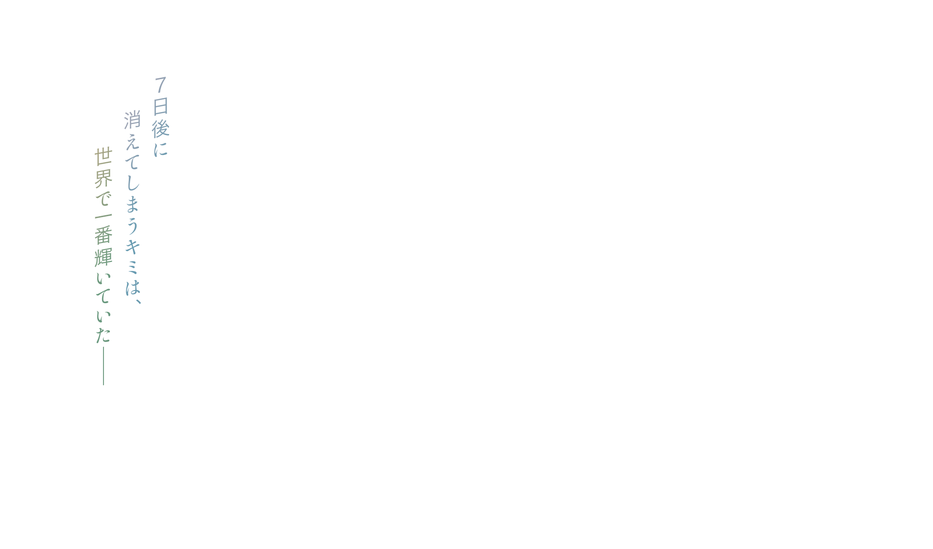 好きな作家の画集を見て、好きな本の話をする…。そんな雪夫と由茉の平凡な日々は、「私ね、あと1週間で死んじゃうの」という由茉の突然の告白によって一変する。その言葉に雪夫の心は乱れ、気持ちが追いつかずにいたが、彼女はすでに自分の運命を受け止め、残りの人生を精いっぱい生きると決めているようだった。そんな思いを受け止めた雪夫は、彼女との残り少ない日々に寄り添う決意をする。